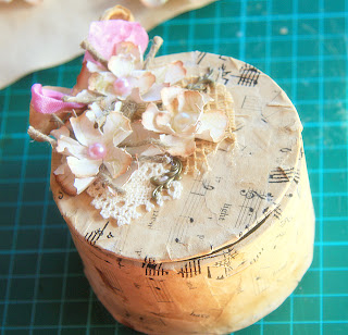 В этой шкатулке крышка делалась отдельно от бобинки, приклеивала её в самом конце с помощью кусочка кружева и пистолета с горячим клеем: